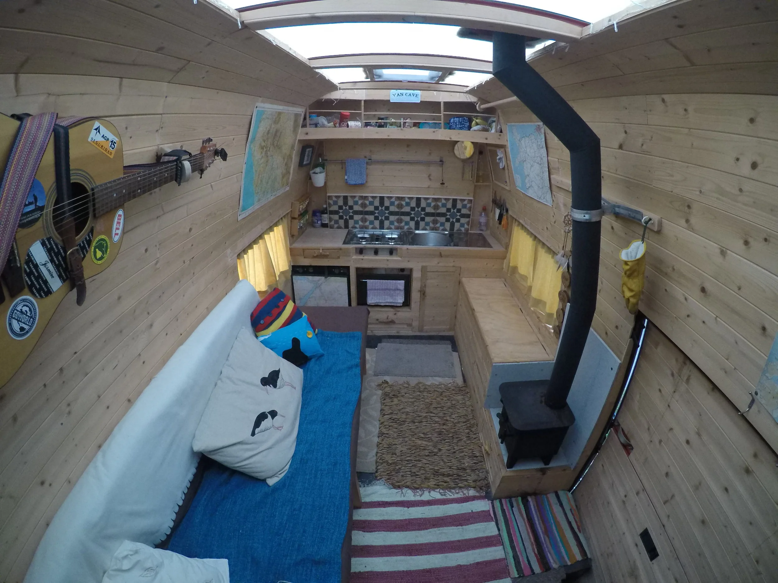 It was just a bare panel van when I bought it for £700, but by the end of those four months it was equipped with sofa, pull out bed, full kitchen, plenty of storage, and of course, a great little wood burner.